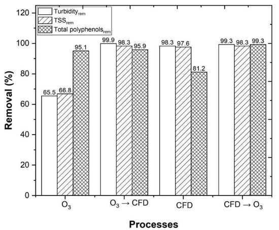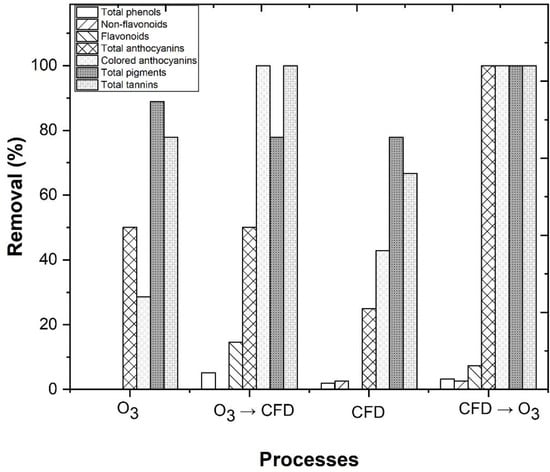 Another alternative to biologic treatments are advanced oxidation processes (AOPs), which are based on the production of hydroxyl radicals () and are capable of promoting, in a non-selective manner, both the degradation and mineralization of pollutants into CO2, H2O, and inorganic salts [14,15]. Among the different AOPs, the following have been reported to be used in the treatment of winery wastewater: the application of the homogeneous Fenton process [16], homogeneous photo-Fenton process [17,18], sulfate radicals [19,20], heterogeneous photo-Fenton process [21,22], and ozonation process [23]. In this work, the application of ozonation, as a complement to the CFD process in the treatment of winery wastewater, was studied. Ozone is an unstable gas, with a characteristically penetrating odor and partial solubility in water. In wastewater treatment, the advantages of ozone are evident, since it is a powerful oxidant, with a redox potential of 2.07 V in alkaline solution, making it able to oxidize several inorganic and organic substances, when compared to other oxidizing agents, such as H2O2 (1.77 V), (1.70 V), Cl2 (1.09 V), and O2 (0.40 V) [24]. In addition, generated H2O2 can considerably enhance the formation from O3 decomposition, during the O3/UV process when compared to conventional ozonation [25,26]. It was observed by several authors that ozone, in combination with UV-C radiation, was effective in the treatment of wastewater with a high polyphenol content, such as that found in the cork manufacturing industry [27], the olive oil industry [28], and the wine distillery industry [29]. In this work, the application of the system O3/Fe2+/UV-C was tested, which, to our knowledge, has not been hitherto performed in winery wastewater treatment and, therefore, its effects in organic carbon reduction are still unknown.