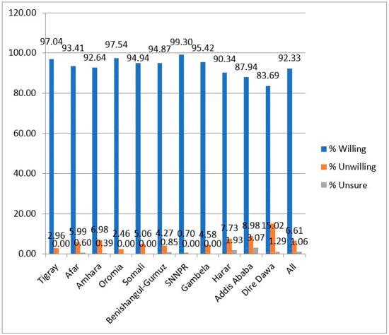 Distribution of respondents based on willingness to get COVID-19 vaccines across the Ethiopia’s regions.