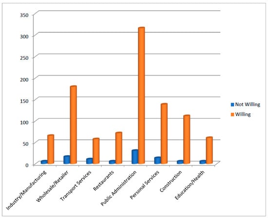 Frequencies of respondents willing to get COVID-19 vaccines across occupational groups in Ethiopia.