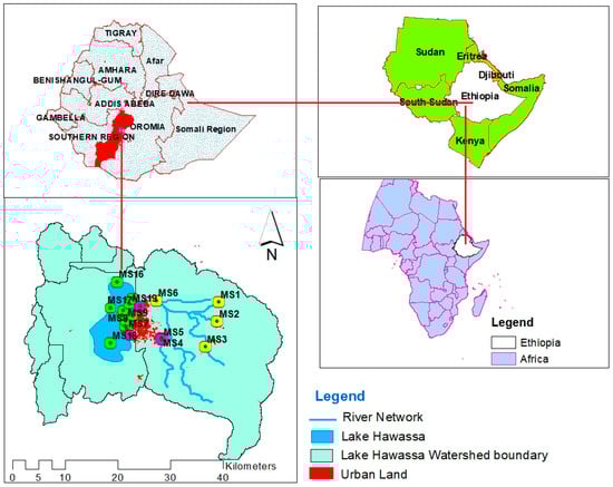 Lake Hawassa watershed is located in the center of the Rift Valley Lakes basin, between latitudes of 6°4′45″ N to 7°14′49″ N and longitudes of 38°16′34″ E to 38°43′26″ E [28,29]. Amongst the seven lakes in the Rift Valley Lakes basin, Lake Hawassa is located between the latitude of 6°33′–7°33′ N and longitude of 38°22′–38°29′ E (Figure 1). The Lake Hawassa watershed is located in Oromiya and Sidama regional state, having a total area of 1407 km2 and 113 km2 of which is Lake surface area [30]. Streams from the eastern catchment flow to Lake Cheleleka and are drained by the Tikur-Wuha river that feeds the Lake Hawassa. This river water has been extensively affected by various point sources [31]. The lake has no surface water outflow except evaporation and abstraction and it is used for commercial fishing and tourist destinations [32].