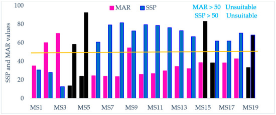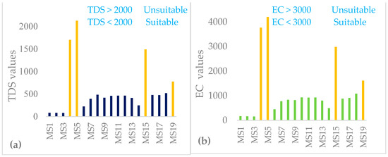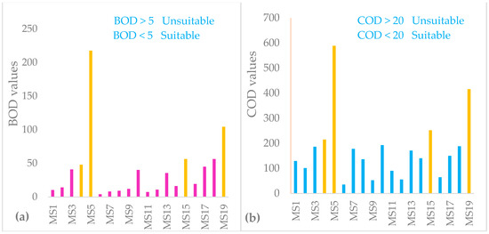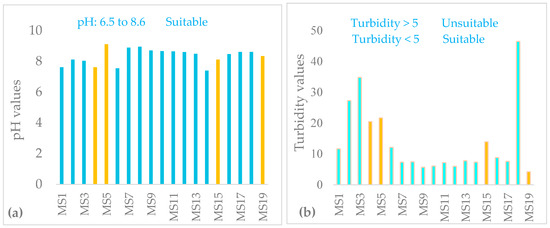 In WQI computation pH is an imperative parameter that determines the suitability of water for the various purposes. The results of the study depicted in Table 7 and Figure 2a. The pH value of the water indicated that the watershed is slightly alkaline as it varied between 7.6 (MS1) and 9.1 (MS5). However, the pH of the Lake Hawassa Watershed is within the permissible limits i.e., 6.5–8.5/9 [64,65,66] for rivers and lakes. A high value of pH is observed in the wet season, which might be due to the dissolution of carbon dioxide and nutrients produced during bacterial decomposition of domestic wastes near the lake [67].