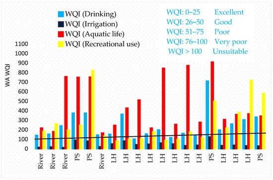 In the literature, the weighted arithmetic water quality index method (WA WQI) was developed [10,20,37,38,39,40] in a large number of studies.