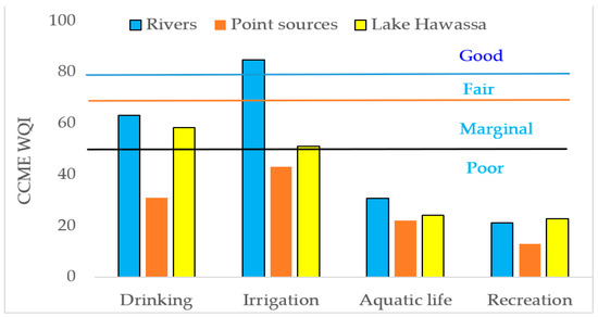 They provide an arithmetic value of CCME WQI water quality status in between 0 (poor) and 100 (excellent) in five descriptive classes as described in Table 4 [16,48,56,57].