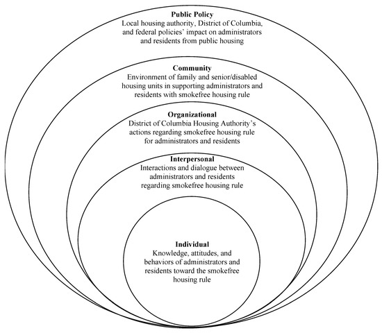 To date, the literature reflects a fragmented approach to understanding the effects of smoke-free policies. The present study applied a social-ecological framework as a novel way to emphasize individual and social environmental factors as necessary targets for evaluation and improvement. Moreover, the framework supports the study assumption that appropriate changes in the multi-unit housing environment will produce changes in individuals and that the support of individuals in the community is essential for implementing effective changes in the home environment [16,17,18]. Accordingly, the purpose of this study is to examine administrator and resident perceptions on multiple dimensions (i.e., individual, interpersonal, organizational, community, and public policy) of the Department of Housing and Urban Development mandated smoke-free rule during its initial year of implementation in District of Columbia Housing Authority multi-unit housing communities.