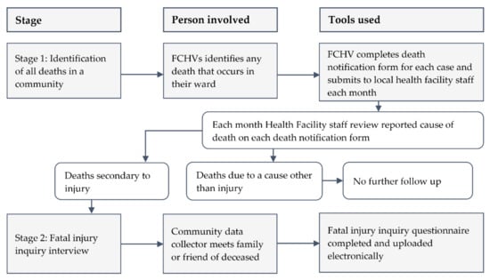 Working with local government authorities, health facility staff and FCHVs, we developed and refined a two-stage method of community fatal injury surveillance, as described in Figure 1.