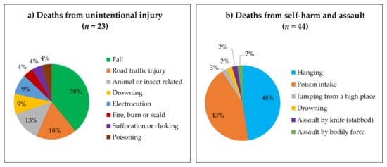 Of the 23 deaths from unintentional injury, 9 (39%) were from falls, followed by road traffic injuries (n = 4, 18%) and animal- or insect-related injuries (n = 3, 13%). Of 44 deaths from self-harm and assault, 21 (48%) were due to hanging, followed by self-poisoning (n = 19, 43%). Of 19 self-poisoning cases, 15 (78.9%) were from agricultural pesticides and four (21.1%) were from insecticides (Figure 2).