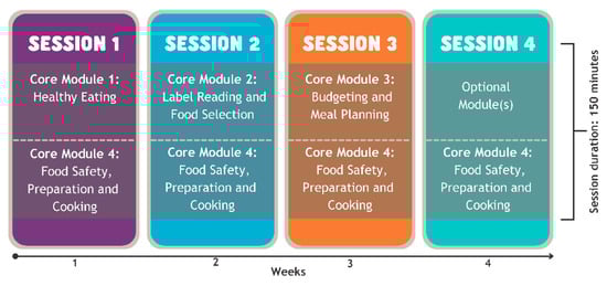 FSA is a four-session, experiential nutrition education program, equating to ten hours of contact time for each program participant (Figure 1). FSA’s curriculum comprises eight lesson plans that are divided into four core modules (taught over the first three sessions), and several optional modules, of which participants may select one (60 min) or two (30 min) to be taught in the fourth and final week. All core module content has been mapped to the four domains (Planning and Management, Selection, Preparation and Cooking, and Eating) and 11 components of food literacy outlined in the empirically tested Australian Food Literacy Model []. Optional modules are offered in session four, to reinforce the food literacy key messages and to enable the contextualisation of content to meet the needs of various different subgroups of participants [].