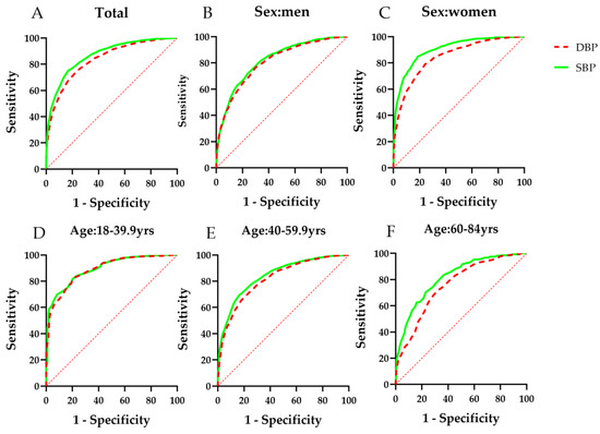 The AUC values of sex- and age-specific blood pressure for identifying arteriosclerosis were 0.868 for SBP and 0.835 for DBP, both of which had effective predictive performance (p < 0.01). The AUC values of both SBP and DBP for women for identifying arteriosclerosis were higher than those for men (Z test, p < 0.01). As age increased, the predictive performance of blood pressure for identifying arteriosclerosis decreased (Z test, p < 0.01). The details are shown in Figure 1 and Table 3.