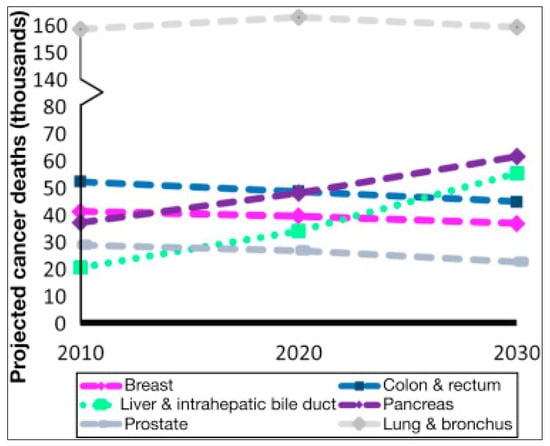 Temporal trends of deaths caused by the most frequent cancers and their forecast in the world from 2010 to 2030.