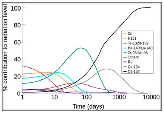 Iodine-131 may give a higher initial dose, but its short half-life of 8 days ensures that it will soon be gone. Iodine-131 remains in the environment for about only 100 days [19,21]. Cesium-137 decay by gamma and beta (electron) emissions produces highly ionizing radiation [22].