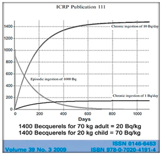 The International Commission on Radiological Protection (ICRP) sets radiation safety standards and recognizes that radiocesium bioaccumulates harmfully in humans. The reported ICRP-figure (Figure 3) compares single ingestion of 1000 Becquerels (Bq) of 137-Cs, a one-time exposure, with the daily ingestion of 10 Bq. On the single exposure, it is noticed that half of the 137-Cs is gone from the body in 110 days. That’s considered to be the biological half-life. Note also that with the routine daily ingestion of 10 Bq of 137-Cs the total radioactivity within the body continues to rise until after about 500 days there are more than 1400 Bq of radioactivity measured in the body [23].