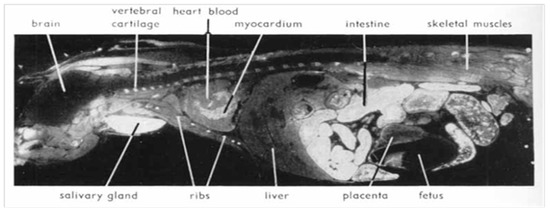 Autoradiogram showing 137-Cs distribution in a pregnant mouse 6 h after intravenous injection. White areas correspond to high radioactivity. Uptake is high in the salivary gland, pancreas, and intestine. In fetuses, concentration is significantly lower than in the mother. In the pancreas, the islets of Langerhans appear to have a slightly lower activity than the acinar tissue. (Reproduced from Nelson et al. [13] with permission of Acta Radiologica, 1961).