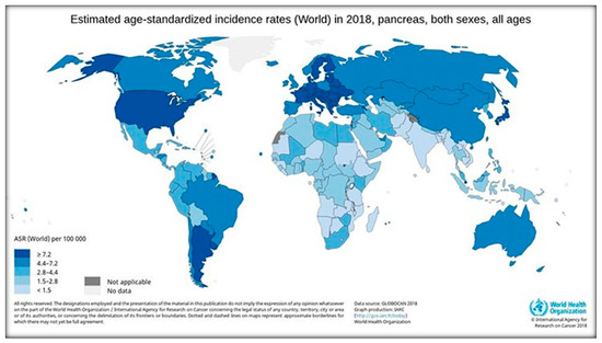 - GBD 2017. Pancreatic Cancer Collaborators. The global, regional, and national burden of pancreatic cancer and its attributable risk factors in 195 countries and territories, 1990–2017: A systematic analysis for the Global Burden of Disease Study. Lancet Gastroenterol. Hepatol. 2019, 4, 934–947. [Google Scholar] [CrossRef]