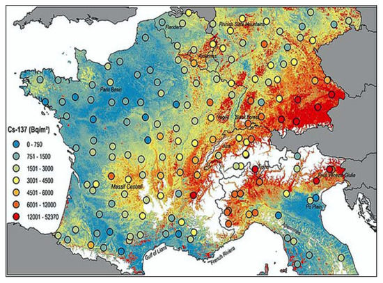 Meusburger et al. [52] set out to make a radioactivity inventory on a continental scale, by analyzing the Chernobyl and total 137-Cs fallout across national boundaries, focusing on a selection of soil samples collected in France, Belgium, Southern Germany, Switzerland, and Northern Italy (Figure 11). High 137-Cs is associated with high altitude. In the mountains, rainfalls enhance radioactive fallouts. In the mountainous Northern Italy (Alps) and the hilly Central Italy (Apennines), PC incidence is higher than in Southern Italy and in islands, where PC mortality compared to that in Northern Italy is −29% in males and −26% in females respectively. In 2000, Moseman [53] reported that meat of over 1000 wild boars killed in Germany in the previous year was contaminated with 137-Cs from Chernobyl, with over 600 Bq allowed per kg of meat. It has been also estimated that 137-Cs from the Chernobyl accident is expected to be detectable in Norwegian cattle and sheep, for over 100 years to come [54]. The Norwegian Food Safety Authority ordered the farmers to feed their animals with safer food if radioactivity is too high. Animals can be also fed with the cesium chelator “Prussian Blue”. Recognized sure effects of heavy radionuclide exposure are many, including radiation sickness, cataracts, thyropathologies, blood diseases, leukemia, tumors, heart, and neuropsychological pathologies, etc.
