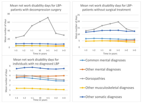 Our study showed trends of diagnosis-specific work disability in patients with lumber spine decompression surgery, as well as in LBP-patients without surgical treatment and individuals with no diagnosed LBP, during the three years before and after the cohort entry date. LBP-patients treated by LSDS had high amount of work disability due to degenerative spine diseases throughout the observation period, with a sharp downward trend during the second year following surgery. However, work disability due to degenerative spine diseases was still about 25% higher three years after than surgery than it was three years before surgery. In addition to musculoskeletal diseases, patients with LSDS also had high work disability caused by other somatic and mental diagnoses, before and after the surgery, indicating for many mental and somatic co-morbidities that are not affected by the improvement in degenerative lumber spine disease. Among all three groups, LBP-patients without LSDS had the highest proportion of patients and mean number of days with work disability due to somatic diagnoses other than musculoskeletal, CMDs, or other mental diagnoses throughout the study.
