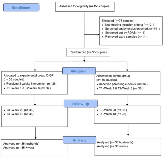 This study generally hypothesizes that if participants empirically receive, using the Zoom platform, the online Gottman’s psychoeducational intervention (O-GPI), as the independent variable, their marital communication patterns (MCP), as the dependent variable, will be changed. Therefore, a single-blind parallel group, randomized controlled trials [] with an experimental longitudinal design was chosen. Participants were observed four times at almost 13-month intervals (10 March 2019–2 May 2020). Therefore, in this study, the “long-lasting effect” of Gottman’s intervention was considered.