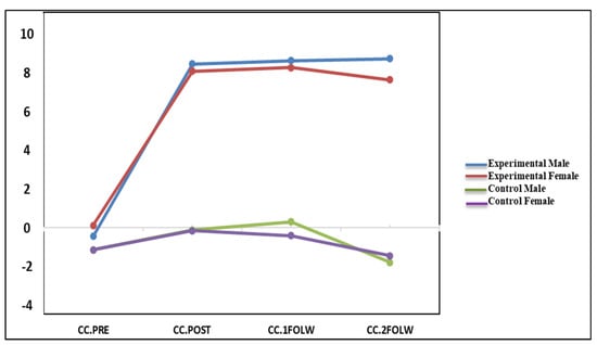 In this study, the interactions between groups, gender and times for all variables (CC, TWDC and MAC) were interesting. The results of the Bonferroni test in Table 2 indicated that there are no significant interaction effects over time as a function of gender or group. The main effect of gender and interaction between gender and group was not significant. In other words, both males and females exhibited the same pattern of CC, TWDC and MAC over time; so, both genders were affected equally by the standard effect of the intervention on their communication.