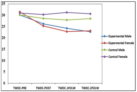 In the current study, the results of the factorial RM-ANOVA for the mean TWDC scores between the experimental and control groups were significant for females across the posttest, first and second follow-up tests (p < 0.01); while they were not significant for males (Table 1). As shown in Figure 3, the findings demonstrated that the effect of O-GPI can persist over time and has a relatively long-lasting effect (at least one year) among Iranian couples. The partial eta-squared value for males in the experimental group was 0.21, which yielded a very large effect of f = 0.51. The partial eta-squared value for females was 0.30, which also yielded a very large effect of f = 0.65 using the guidelines proposed by Cohen []. The results showed that 51% in the variability in the demand–withdraw communication among men and 56% among women might be due to O-GPI. Interestingly, there was a significant interaction gender effect in the revealed result; males and females did not improve similarly in demand–withdraw communication.