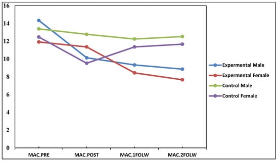 In this study, it was hypothesized that the online Gottman’s psychoeducational intervention can decrease mutual avoidance communication. As can be seen in Table 1, the results between the experimental and control groups were significant for MAC among males and females across the posttest, first and second follow-up tests (p < 0.01). The mean scores show that the mutual avoidance communication pattern for males and females in the experimental group are lower than those in the control group across the period of the study. Therefore, the findings revealed that the effect of the O-GPI could persist over time and for a relatively long time (at least for one year) for Iranian couples. The partial eta-squared value for males in the experimental group was 0.27, which provided a very large effect f = 0.60; for females, it was 0.28, which provided a very large effect of f = 0.62. As shown in Figure 4, the results show that 60% of the variability in mutual avoidance communication among males and 62% in females could be due to Gottman’s psychoeducational intervention. Hence, the findings indicated that Gottman’s psychoeducational intervention has a very large effect in decreasing the mutual avoidance communication pattern among Iranian couples.