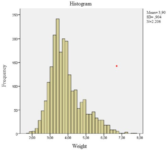 The normality of the anthropometric variables for each age group was checked and it was found that, on numerous occasions, this hypothesis of normality was not fulfilled. An example of this statement can be found in Figure 1, where the asymmetry of the variable weight can be seen, and due to this asymmetry, the variable weight does not present a normal distribution. To correct the asymmetry of the variable, the so-called “process of transformation into two steps” was applied to continuous variables [12].