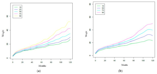 The construction of the percentile chart of the weight variable will now be explained. The R software was used to create this percentile graph—specifically the GAMLSS Generalized Additive Models for Location, Scale, and Shape package. This package is a general framework for fitting regression models where the location, scale, and shape of the response variable vary according to the values of the explanatory variable [13,14]. In addition, the World Health Organization recommends the use of the GAMLSS package for the construction of these percentile tables [15]. Figure 3 shows these percentile charts obtained with the R software (Ross Ihaka & Robert Gentleman, Auckland, New Zealand).