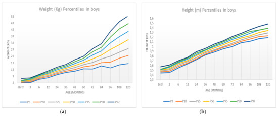 Weight and height percentiles in boys according to age: (a) weight percentiles; (b) height percentiles.