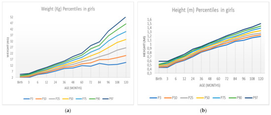 Weight and height percentiles in girls according to age: (a) weight percentiles; (b) height percentiles.