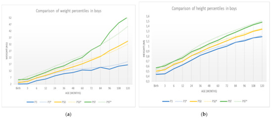 New specific curves for boys (solid) compared to the curves in [8] (dashed): (a) weight-specific curves; (b) height-specific curves.