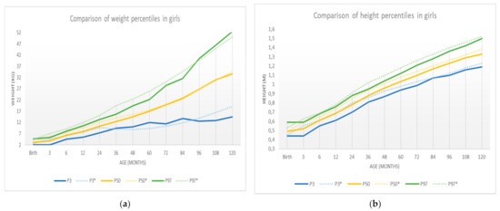 New specific curves for girls (solid) compared to the curves in [8] (dashed): (a) weight-specific curves; (b) height-specific curves.