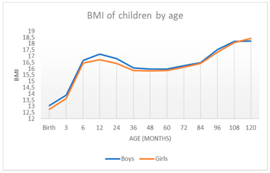 To analyze obesity, which generally affects the health of our country and is especially incipient at an early age, the average BMI in the different age groups was calculated. As can be seen in Figure 8, BMI between boys and girls was very similar, especially between 48 and 120 months. In the first months of life, they begin to be practically equal (between 3 and 6 months). However, in the period between 6 and 36 months, girls had a lower BMI than boys. This is reflected in comparative Table 5. In the first stage of life, the mean differs more between boys and girls, although it should be noted that the standard deviation was lower than after 36 months, when this standard deviation begins to increase, indicating greater variability at older ages.