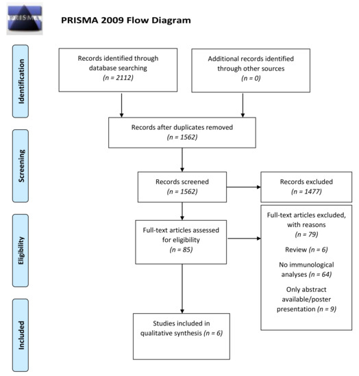 The electronic search of the databases identified a total of 2112 papers as follows: Medline (n = 347), Embase (n = 672), Scopus (n = 686), Cochrane (n = 17), Web of Science (n = 390). All the relevant articles identified through the manual search were observed in the articles retrieved through the electronic search. After the elimination of duplicates and analyses of the titles and abstracts, 85 full texts were analyzed (Figure 1). Finally, six articles were included in the qualitative analysis [27,28,29,30,31,32]. Supplementary Material Table S1 depicts the excluded studies. The Kappa test statistic was 1.0 for the studies analyzed, indicating no disagreement between the reviewers.