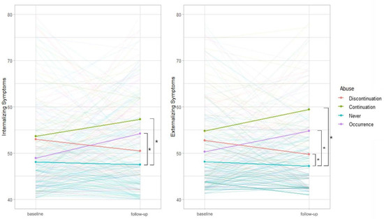 Effect of variation of abuse on internalizing/externalizing symptoms at follow-up. *: Significant relative risk. At baseline, the risk of psychopathology in the Continuation and Occurrence groups significantly increased. The K-CBCL score in the Discontinuation group decreased. Compared to those in the Never group, the internalizing symptoms of the Discontinuation group were no longer significant. Externalizing symptoms decreased, but remained significant.