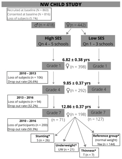 The study is based on a longitudinal research design which forms part of the NW-CHILD study (North West Child Health Integrated with Learning and Development), which represents the primary school period of seven school years. Stratified and random sampling was used to determine the study population. Stratification of the sample was based on school district, school quintile (1–5), and gender. The Department of Basic Education (DBE) supplied a list of all the schools in the North West Province (NWP) for the sample to be compiled. The NWP is divided into eight school districts which, in turn, include 12 to 22 sub districts, respectively, with approximately 20 schools per district (minimum 12 and maximum 47). South Africa also makes use of a poverty classification system to categorize the schools into an appropriate quintile status based on SES factors. The schools’ quintile status is aligned with the National Poverty Table sourced from the National Census data, which includes income, dependency ratios, and literacy levels. This poverty classification is used by the DBE in all the provinces to classify schools into various quintiles. Schools are categorized into five quintiles, with quintile 1 schools representing schools with a low SES and quintile 5 representing schools with a high SES. School quintiles 1 and 2 represent the poorest schools that are exempted from school fees and that are supported by feeding schemes on school days [29]. This study used the quintile school status to categorize the participants’ SES. Only the participants who had full data sets that included baseline and the two follow-up time points were included for the purposes of this study. The baseline measurements were done in 2010 in the grade 1 year of the participants, with the first time point measurements in 2013 representing the group’s grade 4 year, and the second time point measurements in 2016 at the end of the primary school year in grade 7. Figure 1 represents a flow diagram that shows the recruitment process, and the loss to follow-up over the seven year school period to arrive at the final group of participants over the follow-up period that was categorized into different categories of undernutrition.