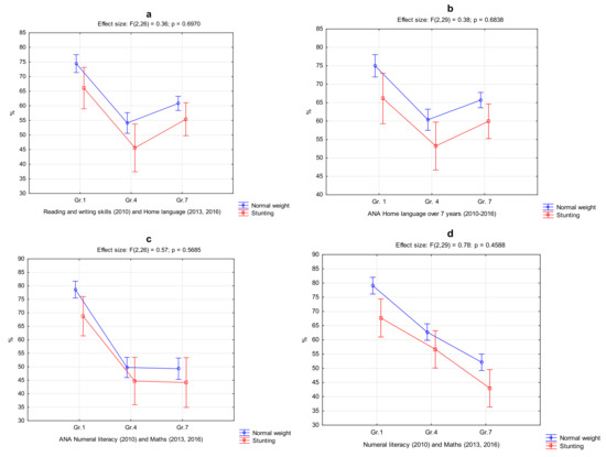 - Beckmann, J.; Lang, C.; du Randt, R.; Gresse, A.; Long, K.; Ludyga, S.; Müller, I.; Nqweniso, S.; Pühse, U.; Utzinger, J.; et al. Prevalence of Stunting and Relationship between Stunting and Associated Risk Factors with Academic Achievement and Cognitive Function: A Cross-Sectional Study with South African Primary School Children. Int. J. Environ. Res. Public Health 2021, 18, 4218. [Google Scholar] [CrossRef]