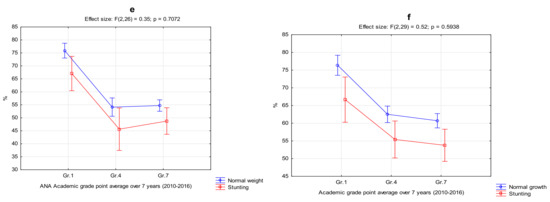The key finding confirmed that stunting had negative and lasting influences on academic performance in language, mathematics, and the grade point averages of girls based on the significantly poorer academic achievements of this group in grades 1, 4, and 7 as well as over the follow-up period of six years (F = 10.43; p = 0.002). Kar et al. [35] report in this regard that poor and insufficient nutrition during early childhood has direct influences on brain development, which is vital for higher cognitive processes. It is also reported that when inadequate nutrition persists over a long period, it may lead to permanent damage that will restrict cognitive development [35]. These results, therefore, confirm that stunting over the long-term can lead to the impediment of cognitive development by causing structural damage to the brain, as reported by Brown and Pollit [11]. Benton [14] confirms in this regard that undernutrition, which already occurs in the first year of life, shows long-term effects on cognitive abilities and behavior related aspects that lead to a lower intelligence quotient and poorer academic performance. Chesire et al. [26] also reported a statistically significant relation between school attendance and stunting. Although the current study did not analyze the specific link between stunting and school attendance, research worldwide confirms that the relation between stunting and school attendance could result in poor academic performance [9,20,21]. The WHO (2016) furthermore reports that poor school attendance due to stunting during childhood combined with poor educational outcomes can contribute to a decline of 22% in the potential annual income of an adult [36,37]. Stunting, therefore, seems to be a risk factor for survival and health during childhood and adulthood that can affect both learning capacity and productivity [3,21].