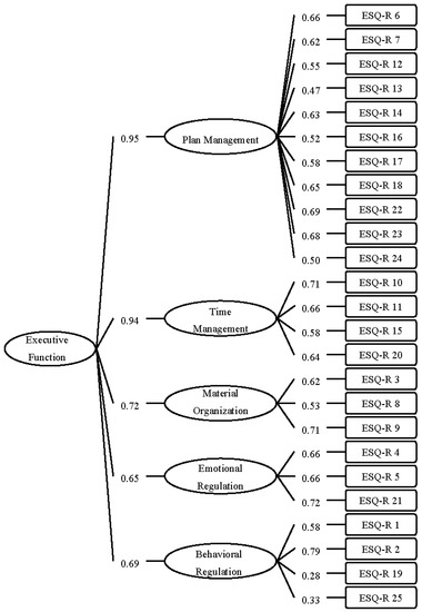 Confirmatory factor analyses were conducted to determine if the 5-factor structure would be retained in the context of the study. While Strait and colleagues [18] suggest a 5-factor model, our results showed that the 5-factor second-order model with five first-order factors (i.e., plan management, time management, materials organization, emotional regulation, and behavioral regulation) and a general (second-order) factor of EF is most preferable. The advantages of using a second-order model are that a first-order analysis provides a narrow, close-up but detailed view of the data, while the second-order analysis provides a wide and general view, providing a different perspective of the data [56,57,58]. Executive functioning has been commonly described as an umbrella term for various cognitive processes/functions that are responsible for goal-orientation, including self-control, behavioral regulation, planning, and organization skills (e.g., [1,55]). Interestingly, our CFA results also show that the emotional regulation dimension has a relatively lower factor loading than the other dimensions. This finding is consistent with the previous study that employed other executive functions measures [59]. Noteworthy, recent studies had suggested activation of the dorsolateral prefrontal cortex (dlPFC), which linked to executive functions, which somewhat improved regulation of emotional interference in selective attention tasks [60,61,62].
