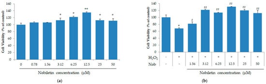Nobiletin increased cell viability in human neuroblastoma cells and inhibited cytotoxicity induced by exposure to H2O2. (a) SH-SY5Y cells were cultured for 16 h and then nobiletin were added to each well. The differences of the cell population were determined by ELISA. Cell proliferation was significantly increased with 3.12 to 50 μM concentrations of nobiletin. * p < 0.05, ** p < 0.01 compared to vehicle treated group; (b) For cytotoxicity of nobiletin, SH-SY5Y cells were incubated into DMEM containing H2O2. Viability of H2O2-treated cells was significantly enhanced with 1.56 to 50 μM concentrations of nobiletin. * p < 0.05 compared to no treated group. # p < 0.05, ## p < 0.01 compared to only H2O2 treated group. Nob, nobiletin.