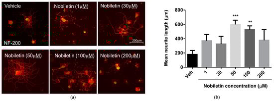 To examine changes in neurite processes of primary cultured DRG neurons at 3 days after SNI with various concentration of nobiletin, we added 0, 1, 30, 50, 100 or 200 μM of nobiletin to each well. Neurite outgrowth of DRG neurons has been recognized as an indicator of indirect peripheral nerve axon regeneration []. As shown in Figure 2, treatment with nobiletin at a dose of 50 and 100 μM significantly increased mean neurite length of DRG neurons compared to those in other concentration.