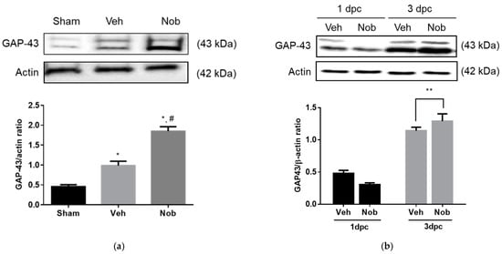 Nobiletin upregulated GAP-43 levels both in primary cultured Schwann cells and in the injured sciatic nerve. (a) Schwann cells were cultured at 3 dpc, and 12 h later, nobiletin was added to each well at a concentration of 50 µM. Schwann cells were incubated for 72 h and then harvested for Western blot analysis. Nobiletin upregulated expression levels of GAP-43 in injury-preconditioned Schwann cells compared to the vehicle group (n = 18, this culture repeated 3 times with 2 rats each). * p < 0.05 compared to shame group; # p < 0.05 compared to vehicle treated group. (b) Nobiletin at a concentration of 50 µM was locally injected into a segment 10 mm distal to the injury site, and 1 and 3 days later all sciatic nerves were dissected. The quantitative graph represented that GAP-43 showed a significant increase in the nobiletin treated group at only 3 dpc compared to subjects in the vehicle treated group (n = 16). ** p < 0.01 compared to vehicle treated group; Veh, vehicle group, Nob, nobiletin group; dpc, days post crush.