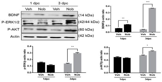To examine the expression of regeneration-related proteins, we analyzed time-dependent alterations in BDNF, ERK1/2 and AKT at an early stage of nerve regeneration. As shown in Figure 4, p-ERK1/2 in the nobiletin group was significantly increased at only 3 dpc compared to the vehicle group, but BDNF in the nobiletin group showed a tendency to upregulate from 1 to 3 dpc. Moreover, p-AKT levels in the vehicle group did not change over time after SNI, whereas nobiletin treatment significantly increased p-AKT expression until 3 dpc.