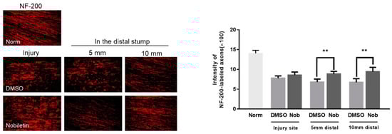 Nobiletin increased axonal elongation 2 weeks after SNI. Sciatic nerves were used for immunofluorescence staining with anti-NF-200 antibody. The nobiletin treated group showed apparently stronger staining of NF-200 in the segment 5 and 10 mm distal to the injury site than DMSO treated group. In each experiment, the intensity of axons stained with NF-200 was measured at injury site, 3 and 5 mm distal to the damage site from three or four nonconsecutive sections. There was a significant difference between DMSO- and nobiletin-treated groups (n = 10, this experiment were assigned to normal control (n = 2), vehicle and nobiletin-treated groups (n = 4, each). Norm, normal group; NF-200, neurofilamen-200. ** p < 0.01 compared to the DMSO-treated group.