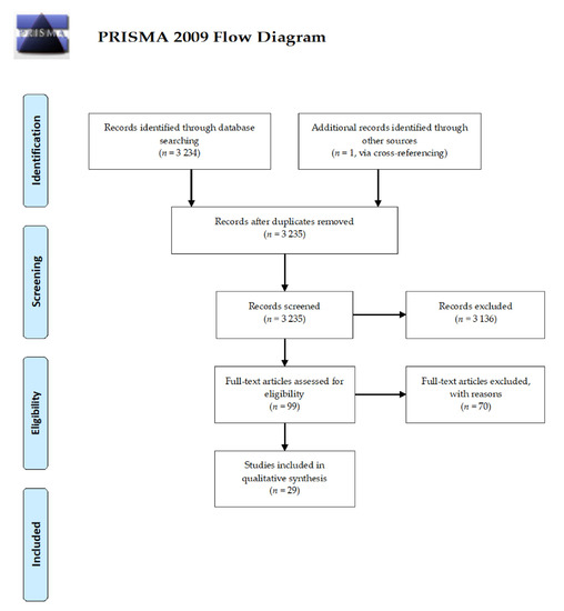The initial search yielded a pool of 3,234 items. One additional item was retrieved via cross-referencing. A subset of 3,136 articles were excluded being irrelevant to the topic under study, when reading the title and/or the abstract. A set of 99 studies were read in full text, and 70 were excluded with reasons, after reading their full text. Finally, based on the previously mentioned inclusion/exclusion criteria, 29 studies were included in the present integrative review, as pictorially shown in Figure 1.