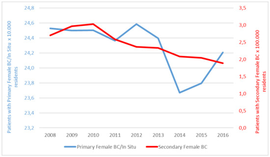 The results will be presented separately from the point of view of the NHS and that of the social security system. As far as the prevalence rate is concerned (Figure 1), on average, 24.3 per 10,000 resident women are found to have a primary/in situ carcinoma, slightly decreasing during the study period, and 2.4 per 100,000 resident women have a secondary carcinoma. Similarly, in this case, we observe a decreasing trend (2.7 per 100,000 in 2008 to 1.9 per 100,000 in 2016).