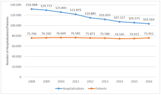 Furthermore, the analysis of HDRs showed a decreasing trend in the number of hospital admissions (Figure 2). The annual value of hospitalizations, amounting to more than one million from 2008 to 2016, dropped, despite the number of subjects being steady over time. In particular, hospitalizations amounting, on average, to almost 117,000 every year, decreased by 22% from about 132,000 in 2008 to 103,500 in 2016. On average, each patient underwent 1.9 hospitalizations.