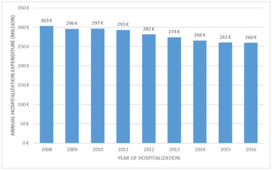 From 2008 to 2016, the annual expense of the direct costs attributable to these hospitalizations dropped by more than 17%, in line with their negative trend. During the reference period, the annual average cost amounted to more than €280 million, thus corresponding to a total expense of over €2.5 billion (Figure 3).