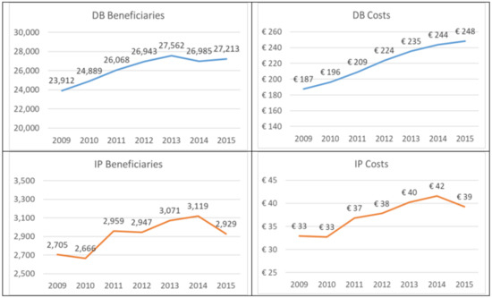 Considering the results related to the provision of social security benefits by the National Social Security Institute, Figure 4 shows the trend of beneficiaries over time (i.e., the benefits provided each year and the related costs for primary, in situ, and secondary carcinoma). The analysis shows annual means of about 29,000 beneficiaries of social security benefits, of which 90% received DB. Overall, the annual number also increased by 13% between 2009 and 2015 (+14% for DBs and +8% for IPs).