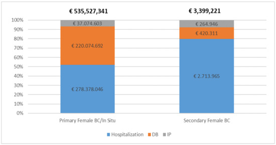 Finally, analyzing the overall economic impact of breast cancer from the point of view of the NHS and the social security system (Figure 5), the average annual total cost reached almost €539 million. As previously noted, all these costs are due to primary/in situ cancer which involves an annual cost of €278 million, €220 million, and €37 million, respectively, for hospitalizations, DBs, and IPs. For the same cost items, secondary cancer has an annual weight of €2.7 million, €420,000, and about €265,000, respectively.