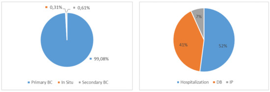 Hospitalizations, amounting on average to 117,000 each year, from 2008 to 2016 dropped by 22%, although the number of subjects (about 75,000 each year) is steady over the period considered. A total of 99.2% of the subjects were diagnosed with primary/in situ BC, while only 0.2 were diagnosed with secondary BC. Just like hospitalizations, the annual expense also recorded a 17% contraction. In the reference period, the annual average cost amounted to more than €280 million, corresponding to a total expense of over €2.5 billion.