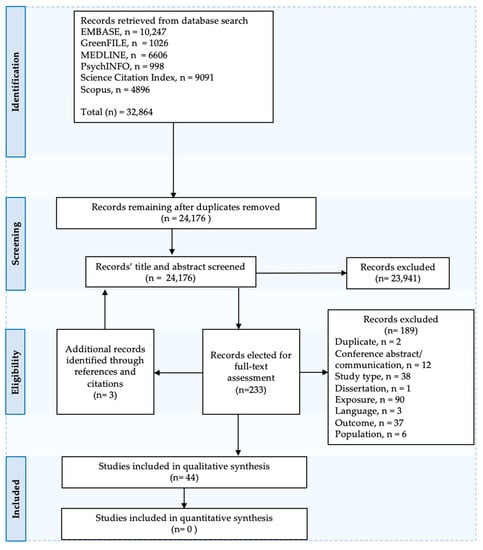 The PRISMA-P flowchart in Figure 1 shows the process of identification, screening and inclusion of studies. The search yielded 24,176 studies after removal of duplicates (Figure 1). Of these, 23,941 were excluded during the title and abstract screening stage, leaving 233 studies for full-text assessment. One hundred and eighty-nine full-text records were excluded during that stage, leaving 44 studies for the qualitative narrative synthesis. Just under half (n = 90, 47.6%) of the excluded studies in the full-text screening stage did not include a green or blue space exposure, while another 38 (20.1%) studies did not have an observational longitudinal study design. A further 37 (19.6%) studies were excluded based on outcome, which either did not fit the definition of an NCD (n = 22), measured mortality (n = 3), did not use a validated instrument (n = 4), examined acute and/or infectious diseases (n = 7), or did not include a health condition (n = 1). Six studies were excluded because of the population type (all children) and 13 because of the publication type (one dissertation and twelve conference papers). Two records were also excluded because they were duplicates (See Supplementary Material S4).