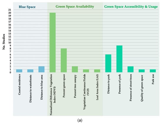 Figure 2a,b provides an overview of the type and frequency of exposures and primary outcomes of the studies. Some studies used multiple indicators of green and blue space exposures and assessed more than one relevant outcome (see Table 1 for more information). There was high variation in exposure indicators, but a large proportion measured green space availability. The Normalised Difference Vegetation Index (NDVI) was the most frequently used indicator of green space availability, followed by percent green space. Almost all accessibility indicators measured either distance or presence of an urban park. One study measured green space usage [], while only four studies measured exposure to blue space [,,,].